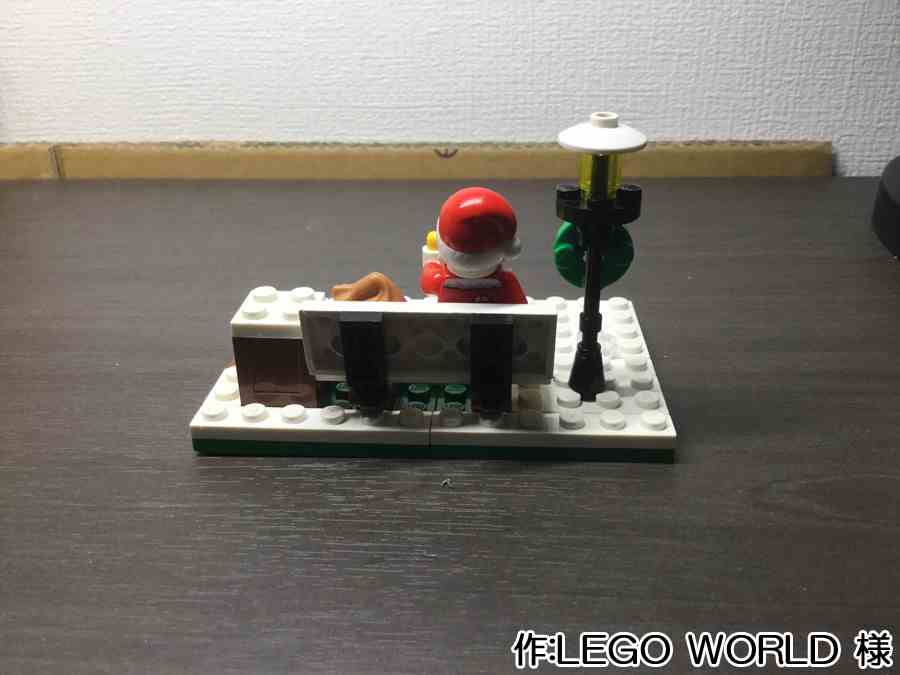 - クリスマスに雪が積もった様子を再現しました。ベンチや街灯の上を白くし、地面も白い板をはり、所々凸凹にしました。