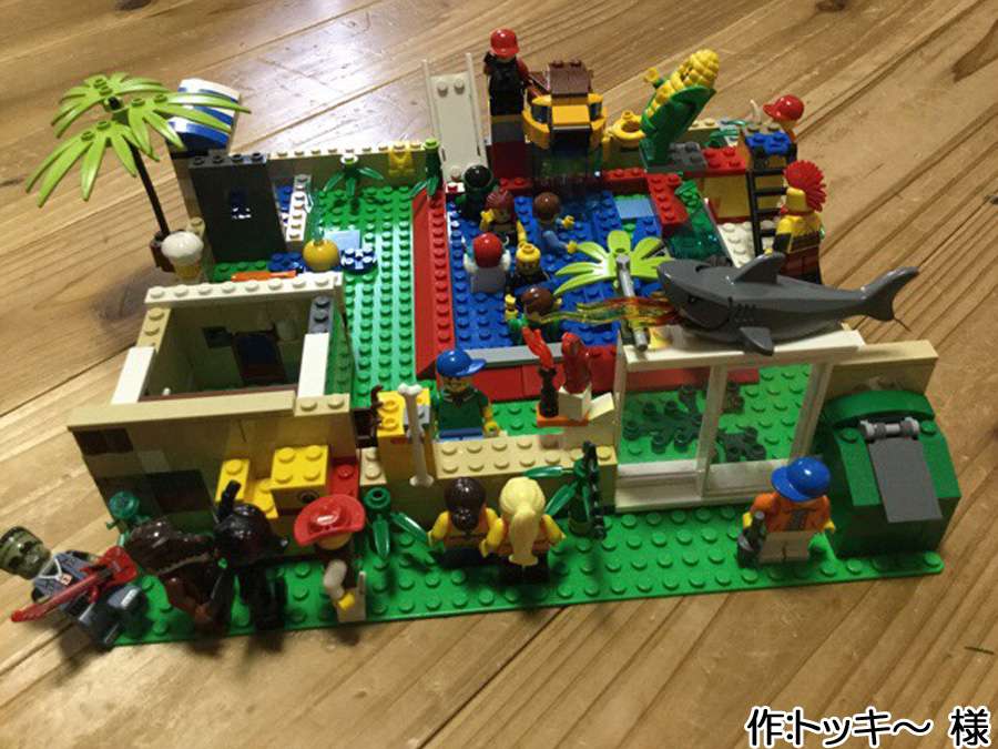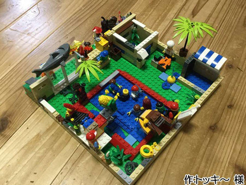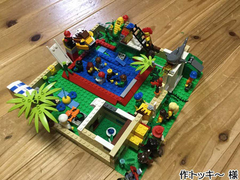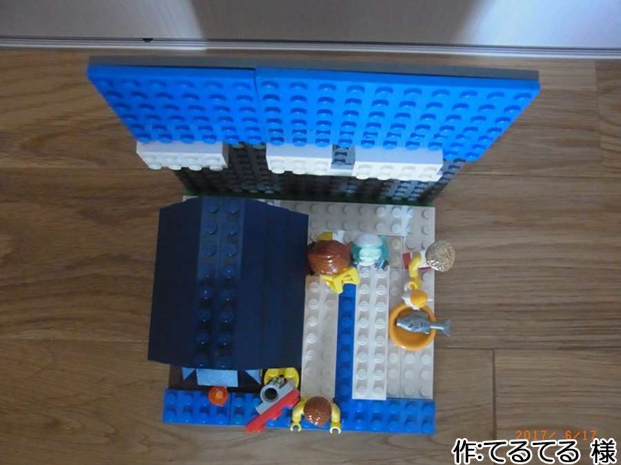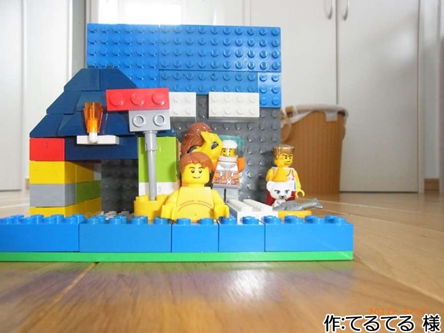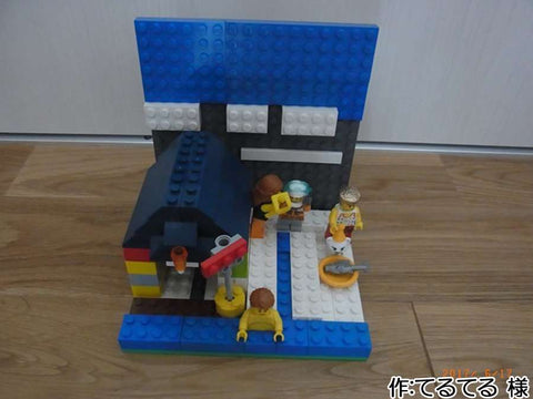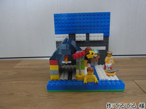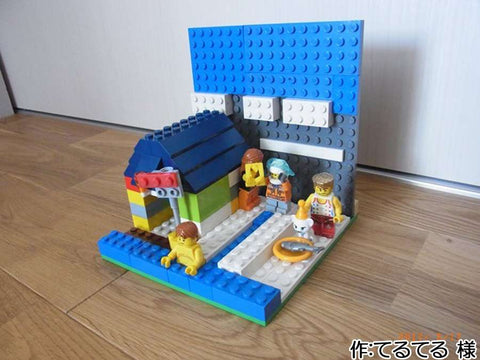 - 空にする青いパーツがあまり見つからなかったので、 まずくもにする白いパーツを空の下につけました。 あまったところにどうろにするタイルをつけました。 うみのいえもつくりました。