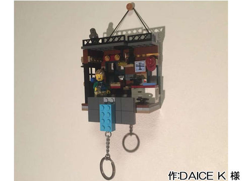 - 家の鍵などにレゴのキーホルダー(写真の水色のブロック)をつけて、鍵を掛けておけるレゴのキーハウスを作りました。 家の内装は登山家の小屋のような設定です。中央のテーブルにキラリと光るダイヤが印象的なキーハウスです。