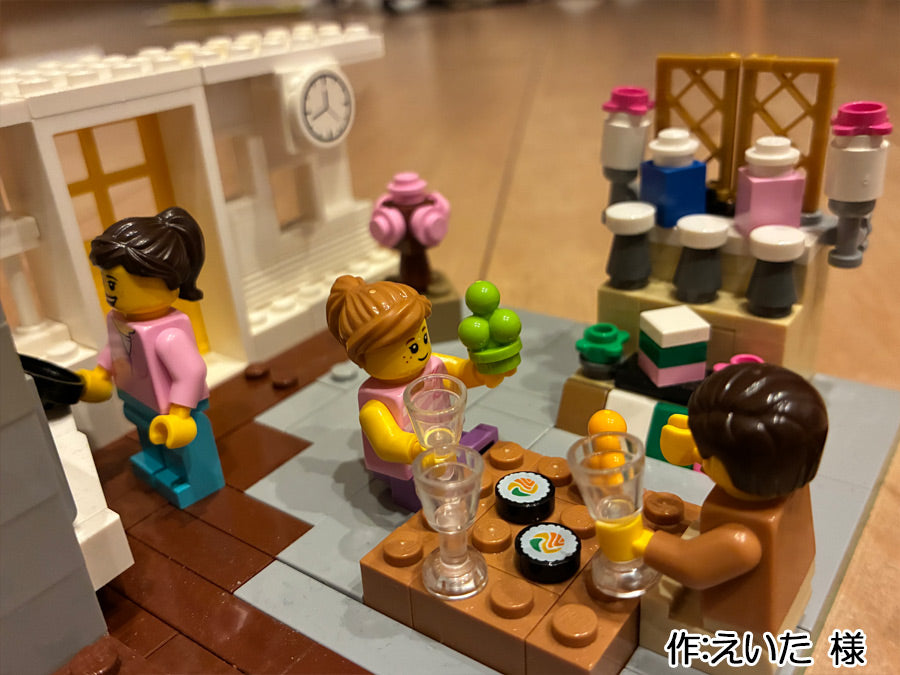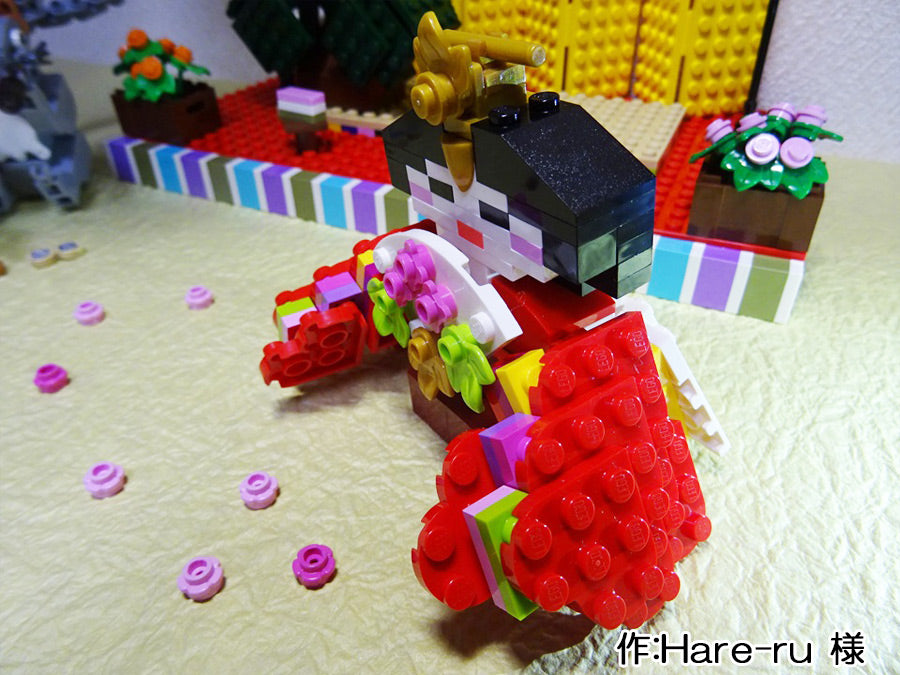 - ひな祭りのパーティーをやってる様子をレゴで作りました。レゴの家に収まるサイズの雛壇や桃の花にこだわりました。女の子が持っているのはひなあられです。