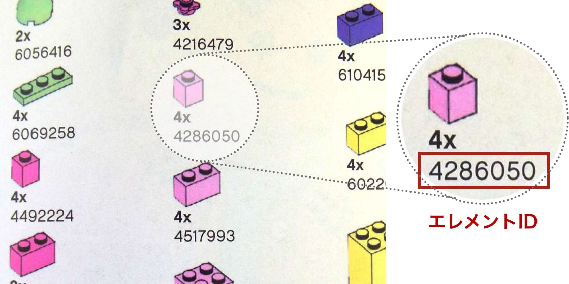 一部を除き、レゴのセット商品のインストラクション(説明書)の最後のページは各パーツが何個入っているかが一目で分かるパーツリストが記載されています。 パーツごとに5〜7桁の番号が記載されていますが、これは「エレメントID」といって、そのパーツの形状・色・プリントまでを特定する固有の番号です。基本的にこの番号さえ分かればパーツが特定できます。