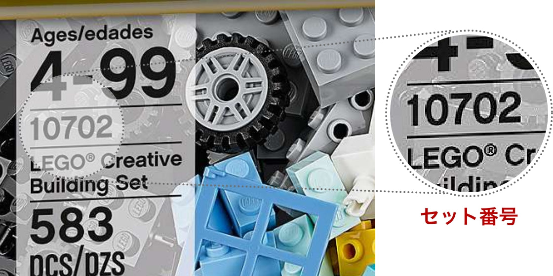 外箱に4桁または5桁(特殊なセットは6〜7桁のものもあります)のセット番号が記載されています。この番号がわかるだけでもかなりの絞り込みができます。