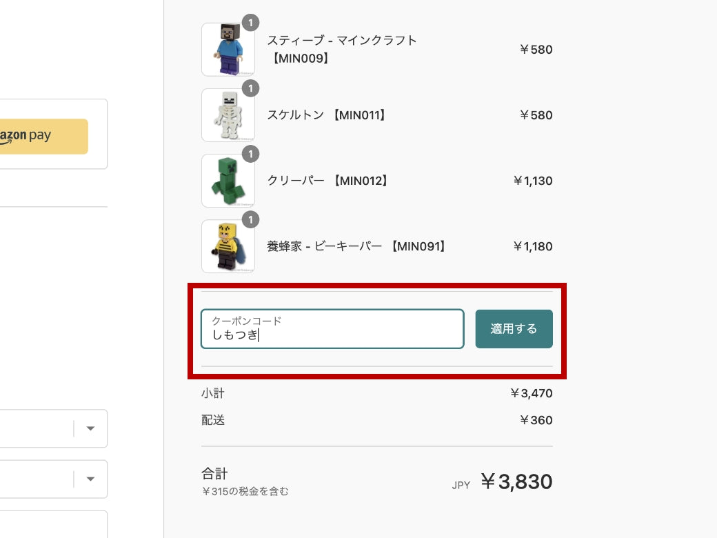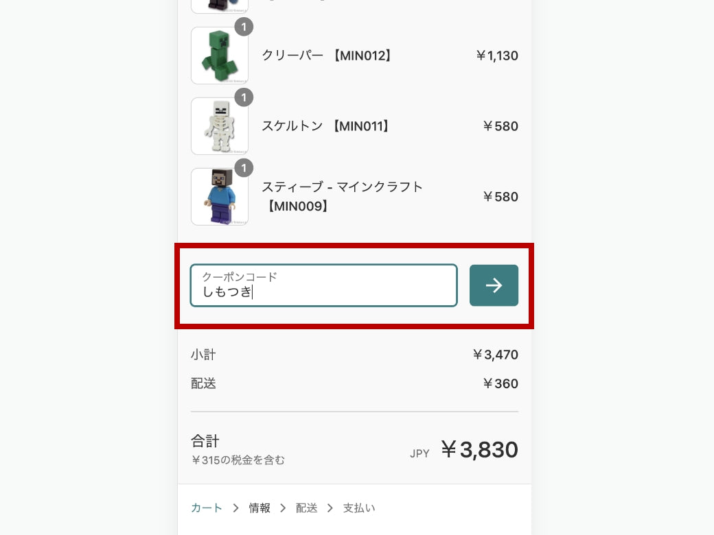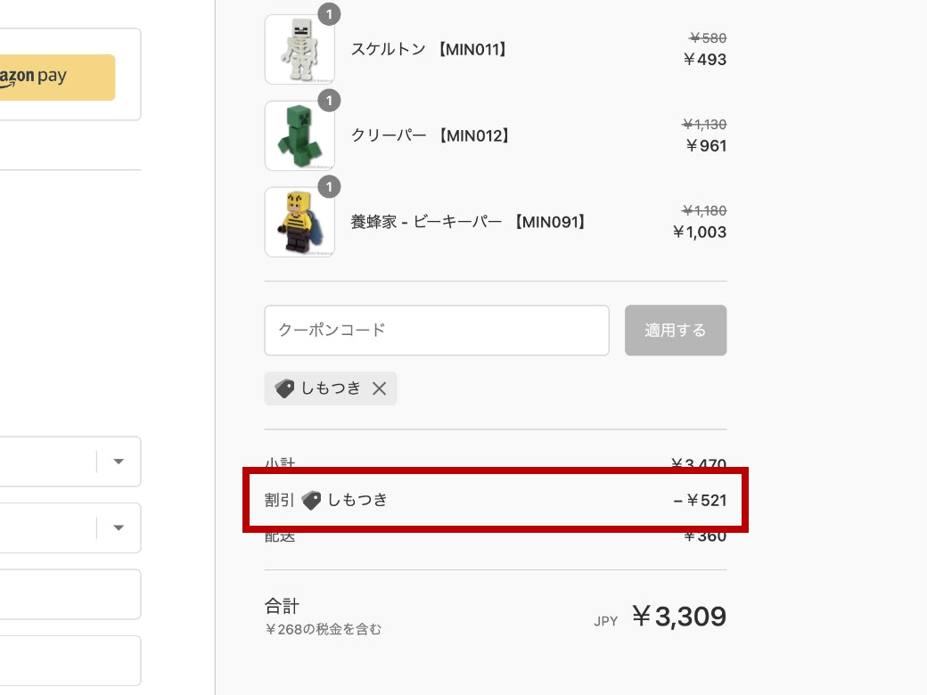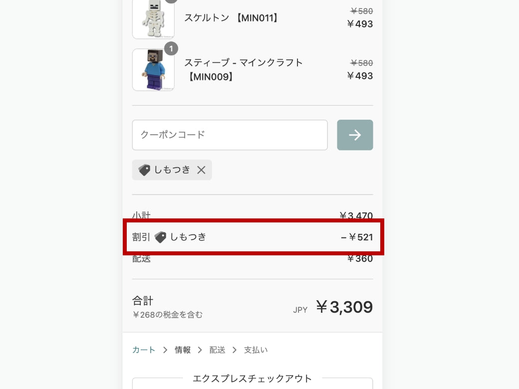クーポンコードが有効なものであれば、割引金額が表示されます。